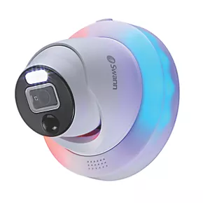 Security camera with red and blue flashing lights, bright sensor spotlights and sirens to prevent crime. Night2Day allows colour video at any hour, up to 10m Powerful night vision up to 40m. 4K ultra HD video for detailed viewing, can be watched live when connected to a CCTV kit and smart device. Features heat and motion detection and microphone for audio capture.