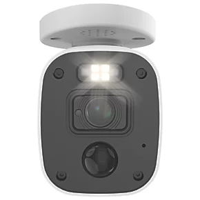 Security camera with red and blue flashing lights, bright sensor spotlights and sirens to prevent crime. Night2Day allows colour video at any hour, up to 10m. Powerful night vision up to 40m. 4K ultra HD video for detailed viewing, can be watched live when connected to a CCTV kit and smart device. Features heat and motion detection and microphone for audio capture.